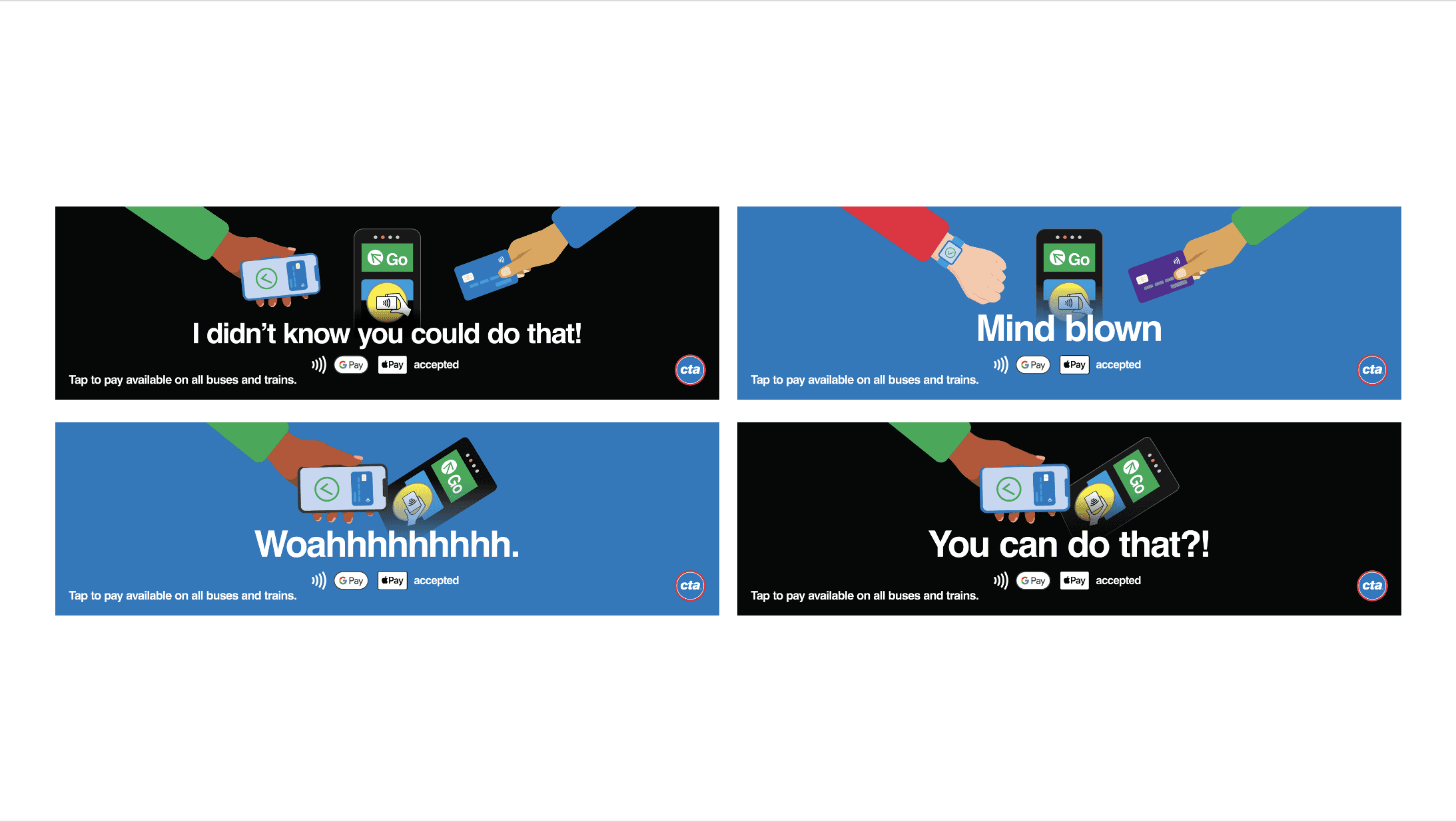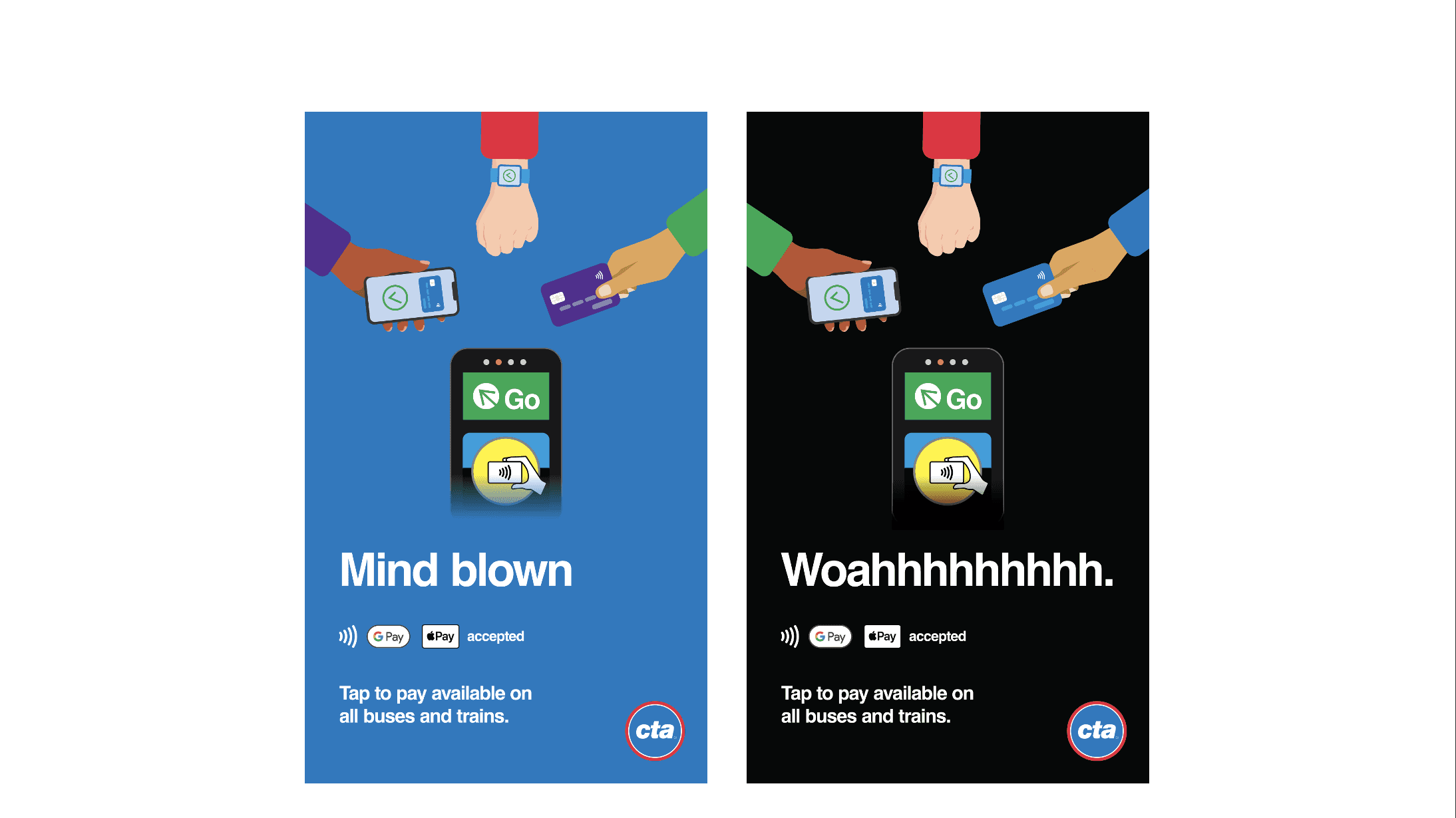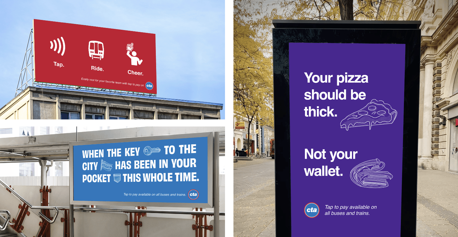 The CTA needed a campaign to bring awareness to contactless payment methods being accepted on trains and buses. As the sole visual designer on the team, I developed this campaign from the ground up.