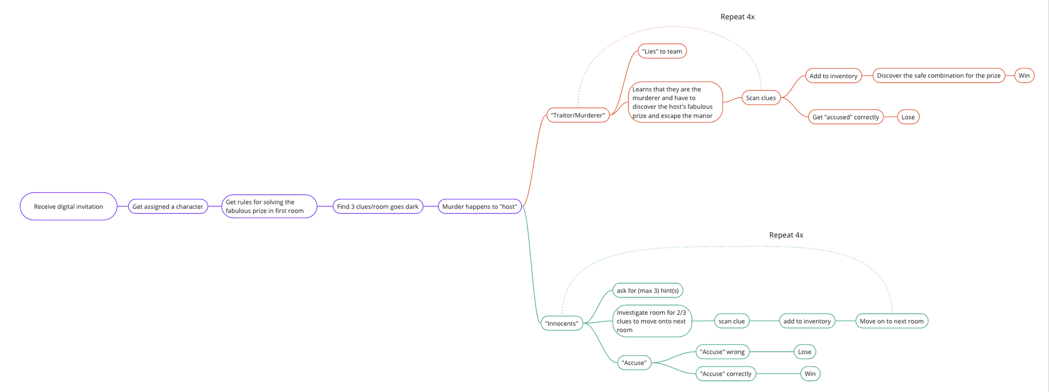 Our team spent a lot of time and used countless flash cards to figure out the game system for the experience. We explored multiple versions of the game and thought about aspects such as are all the characters completing the same actions, how are they interacting with the physical and digital space, and what are the win/lose cases. Ultimately, we settled on a game where one player becomes the murderer while the rest of the group acts as detectives. However, both teams complete the same scanning action with their phones to collect clues in their inventory. While the murderer is looking for clues to solve the original 'fabulous prize' task, the rest of the characters are looking for clues about the murderer.